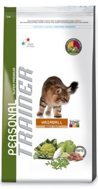 für 19.95€ kaufen ···· Miscota Poland, Czech Republic, Greece and Hungary - Online Shop for Pet Supplies Dry Food for Cats Trainer Hairball \nAdult cat aged from 1 to 7 years\nTrainer® Personal Hairball satisfies the unique necessities of cats with particular needs.\nThe use of animal protein obtained from fresh meat and green functional ingredients (Pomega3®, apple extract, spirulina algae, autolysate of fish, and broccoli) favour the health of skin and fur, thereby reducing the risk of an excessive loss and ingestion of fur. \nA complex mix of natural fibres (pea fibre, corn fibre, Mannato-oligosaccharides)prevents the formation and accumulation of fur and facilitates its expulsion.\nNo artificial preservatives, colourings or appetizers added\n \n ····· 1042012843