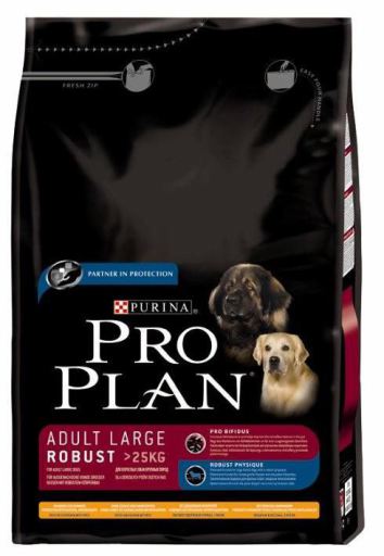 ····· lezzter Preis 53.95€ ···· Miscota Poland, Czech Republic, Greece and Hungary - Online Shop for Pet Supplies Dry Food for Dogs Pro Plan Puppy Robust Large Breed Chicken and Rice PRO PLAN PUPPY LARGE BREED ROBUST ® Rich in Chicken with Rice\nThroughout history, large breed dogs have been used for their strength or speed, which has led to two fundamentally distinct body types: Robust and athletic. New studies have shown that these two body types have different nutritional needs and even so during their growth. For example, a large and robust breed dog tend to have more body fat and would benefit from a reduction in calorie intake to prevent weight gain. In contrast, large athletic breed dogs expend more energy in daily activities and therefore require more energy diet. In fact, large athletic breed dogs use more energy than the robust, even when resting.\nExamples of large breed athletic and robust:Athletic RobustBoxer Basset HoundDalmatian Bernese Mountain DogDobermann BloodhoundGerman Shepherd BullmastiffGreat Dane KomondorGreyhound MastiffGreyhound Irish NewfoundlandPointer RetrieverSetter RottweilerWeimeraner San Bernardo\nComplete food for large breed puppies robust physique (over 25kg to reach maturity).\nProduct InfoPuppy Large Robust is composed to meet the specific nutritional needs of the larger puppies (adult weight> 25 kg) with a robust physique, between 2 and 24 months. Large breed puppies tend to by nature, have a lower metabolism (use less energy) than large breed of athletic physique. This food specially adapted physical supports robust because it promotes lean body mass.\nOptiStart\nFormulated with Colostrum, found in the first milk, and rich in natural antibodies has been proven * to enhance the immune response to help strengthen the protection conveyed by his mother. It also helps to balance the good and bad bacteria in the gut to help puppy resist common disorders in puppies.\nRobust physiqueContains L-carnitine combined with appropriate levels of protein and fat to maintain harmonious growth for healthy development of joint because puppies with a robust physique tend to gain excess weight easily\nBRAIN AND VISIONContains DHA, an omega 3 fatty acid found naturally in breast milk, essential for better brain development and vision. ····· 1042011985