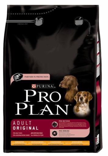 für 40.95€ kaufen ···· Miscota Poland, Czech Republic, Greece and Hungary - Online Shop for Pet Supplies Dry Food for Dogs Pro Plan Adult Original Chicken and Rice Complete nutrition and protection for adult dogs\nPRO PLAN Adult Original is made with high quality chicken and highly digestible rice as the main ingredients, and no colourants and preservatives. The PRO PLAN combination of natural food ingredients and extra vitamins and minerals are scientifically selected to help support your dog's immune system, digestive system and skin & coat. Everything he needs for a lifetime of natural protection.\n OPTI-BALANCE: all nutrients included at optimal levels to help the immune system work optimally and in harmony with each other\n Enhanced vitamin E and C levels to help fight free radicals and support a strong immune system\n High-quality fat, protein and carbohydrate to help support and protect the digestive system\n High quality protein, omega 3 & 6 fatty acids, vitamins and minerals to help build a strong and healthy skin and coat.\nDaily Feeding Recommendation\nThe recommended daily amounts should be adjusted according to weather conditions (more will be consumed in cold weather if the dog lives outside), the animal's level of activity and its physical condition. Clean, fresh water should be available at all times. Keep food in a cool and dry place.\n ····· 104202630