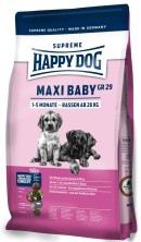 für 52.95€ kaufen ···· Miscota Poland, Czech Republic, Greece and Hungary - Online Shop for Pet Supplies Dry Food for Dogs Happy Dog Happy Dog Maxi Baby 1 - 6 months GR-29 A puppy food for large breed puppies must meet particular requirements: The croquettes must be bigger, to prevent them being wolfed down. The proportions of energy and protein in the puppy food must be adapted to the special requirements of the first intensive growth phase.\nMaxi Baby GR 29 puppy food contains high-quality poultry, lamb, marine fish, rice and high-quality New Zealand mussels in a recipe recommended by vets with 29% protein. The puppy food is therefore optimally suited to the gentle and problem-free feeding of even sensitive large breed puppies from 4 weeks up to and including 5 months.\nIdeally at 6 months the diet will gradually be changed from puppy food to the protein-reduced food Maxi Junior GR 23. This will avoid an overload of protein in the puppys 2nd growth phase.\nThe varied and balanced puppy food with the unique Happy Dog Junior Plus concept prevents any problems arising from insufficient nutrition. \nSupreme Junior: The Revolution in Junior feeding!\nThe recipes for our Supreme Junior products are based on the innovative 2-phase concept :\nPhase 1: Providing the higher protein content needed by medium and large breeds for healthy growth.\nPhase 2: Reduction of the protein content according to need offers the highest possible security when feeding breeds which are sensitive to growth\nAvailable in: 1 kg \n 4 kg \n 15 kg ····· 104202752