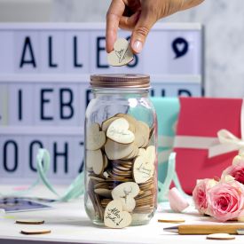 für 14.99€ kaufen ···· Monsterzeug.de - Geschenke & Gadgets Dieses verschließbare Hochzeitsgästebuch - Wunschglas hat einen äußerst herzlichen Inhalt: 100 kleine Holzherzen, die sich mit Glückwünschen beschriften lassen! Ein ideales Präsent zur Hochzeit! ····· 102971248