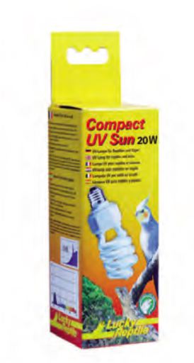 für 30.95€ kaufen ···· Miscota Poland, Czech Republic, Greece and Hungary - Online Shop for Pet Supplies Light Bulbs for Reptiles Lucky Rep Compact Uv Sun With the new generation of the Compact UV Sun we could maintain the lamp performance while decreasing the wattage compared to the old 15W and 23W models.\nFor the development we could win a German factory which is also making the UV Sun T5 and can guarantee a well balanced UV spectrum.\nSpecial atttention was paid to a natural spectrum and not to increase the UVB output unproportionally which would lead to a bad light quality but only about 20% more of UVB. \nA good reflector will bring more than 200% of UVB to the animal. Therefore we recommend the use in the Lucky Reptile Thermo Socket plus Reflector lamps models 63202/63222 for best UV and light output. ····· 104208832