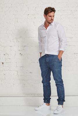 ····· 1038633Diese moderene Jeans erinnert mit den Bündchen am Beinabschluss nicht nur im Stil an eine Jogginghose, sie ist auch genauso bequem. Dafür sorgen der angenehme Denimstoff aus Biobaumwolle mit einem Anteil von 3% Elastan, für maximalen Tragekomfort. Tiefsitzende Gesäßtaschen und die mittelblaue Vintage-Effekt-Waschung sorgen zusätzlich für einen besonders lässigen Look. Alle unserere hochwertigen Jeans sind vegan und werden ohne den Einsatz schädlicher Chemikalien umwelt-und ressourcenschonend hergestellt.