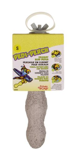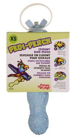 für 5.95€ kaufen ···· Miscota Poland, Czech Republic, Greece and Hungary - Online Shop for Pet Supplies Perches & Posts for Birds Hagen L.W PEDI-PERCH - MINI The Living World® Pedi-Perch is a self grooming, non-toxic, cement perch for birds that helps trim and maintain blunt, well-groomed nails. The multi-grip, wavy surface promotes foot circulation and helps prevent arthritis and atrophy. In addition, it also helps clean and condition the bird's beak. Install Pedi-Perch on the cage door, provided that it is not the highest perch available. Always have a variety of perches in the cage to prevent foot problems, such as bumble foot. Monitor the health of your bird's feet regularly.\nTo clean, scrub Pedi-Perch under water with soap. Ensure that it is completely dry before putting it back in the cage.\nSuggested species: Cockatiel and Lovebird\nNote: Bird feet should wrap 2/3 around the\nperch and should not meet or overlap.\nDiameter: 2.8 cm (1)\nLength: 12 cm (4.75")\n" ····· 104201547