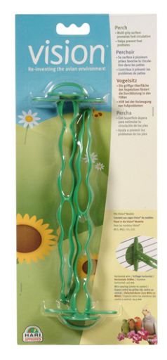 für 11.95€ kaufen ···· Miscota Poland, Czech Republic, Greece and Hungary - Online Shop for Pet Supplies Perches & Posts for Birds Hagen VISION PERCHAS 2PC VERDE 2PC,M11,M12,L11,L12 Ergonomically designed Vision® Perches feature a unique multi-grip surface that promotes foot circulation and helps prevent foot problems in birds. The perches are designed to be accessed from the exterior, a non-invasive approach that reduces stress on your bird during cage maintenance.\nInstallation is easy, simply insert the perch between two cage bars and rotate 90 degrees to lock in place.\nFor use on cages with horizontal bars only. Requires a bar spacing of 2 cm ( in). Fits Vision® cage models M11, M12, L11 & L12.\nColour: Green. ····· 104201618