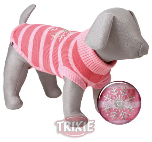 Miscota Poland, Czech Republic, Greece and Hungary - Online Shop for Pet Supplies Sweaters for Dogs Trixie Jersey Richmond - With polo neck and reinforced hem\n- With stylish detail on back\n- Loops for hind legs\n- Made of synthetic wool\n- Size: XS 36 cm \n- Length: 30 cm\n- Colour: pink\n ····· 104209097