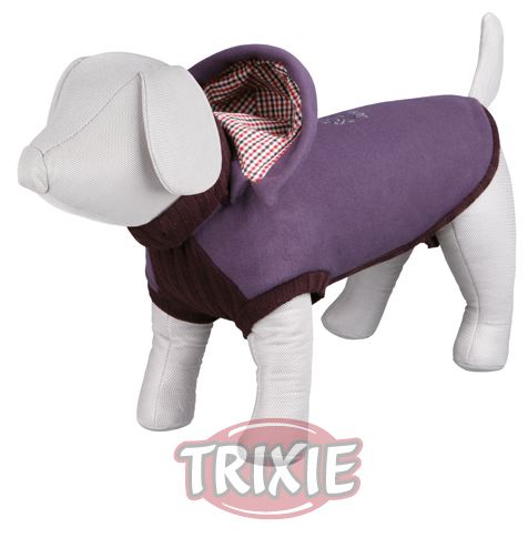 Miscota Poland, Czech Republic, Greece and Hungary - Online Shop for Pet Supplies Sweaters for Dogs Trixie Jersey Salento - With polo neck and removable hood\n- With slot for attaching lead\n- Perfect fit due to elastic stomach insert\n- With stylish detail on back\n- Hemmed loops for hind legs\n- Made of thick fleece and synthetic wool\n- Size: S 40 cm\n- Length: 33 cm\n- Colour: purple\n ····· 104205486