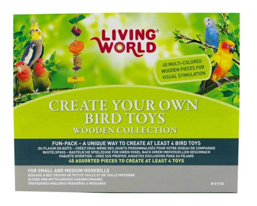 für 18.95€ kaufen ···· Miscota Poland, Czech Republic, Greece and Hungary - Online Shop for Pet Supplies Toys for Birds Hagen L.W WOODEN COLLECTION 28 PC KIT PAJARO GRANDE 1 Living World® Create Your Own Bird Toys is a do-it-yourself toy kit that lets you create your own bird toys. This is the perfect item for people who want to build custom-made toys specifically suited for their birds. The kit contains all you need to make at least 4 unique bird toys. You will find a variety of textures, shapes and colours that have been carefully selected to create interest, encourage play, exercise, and help condition your birds beak. All pieces are made of non-toxic materials and are safe for chewing and manipulation with your birds beak, tongue and feet. Once you have created your unique toys, place them where they can be easily accessed. All Living World® bird toys, including this one, are designed to keep birds stimulated by encouraging shredding, chewing and preening. For Medium & Large birds. Wooden Collection\n28-piece kit includes:\n20 Assorted wooden pieces\n4 Clasps\n1 Cotton covered Sisal rope\n1 Cotton rope\n2 Sisal ropes\n ····· 104201577