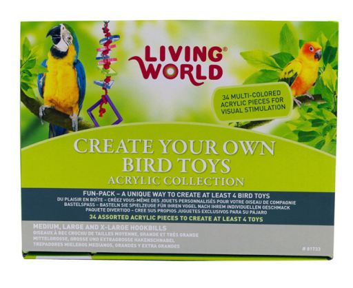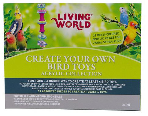 für 18.95€ kaufen ···· Miscota Poland, Czech Republic, Greece and Hungary - Online Shop for Pet Supplies Toys for Birds Hagen L.W ACRILIC COLLECTION 34 PC KIT PAJARO GRANDE Living World® Create Your Own Bird Toys is a do-it-yourself toy kit that lets you create your own bird toys. This is the perfect item for people who want to build custom-made toys specifically suited for their birds. The kit contains all you need to make at least 4 unique bird toys. You will find a variety of textures, shapes and colours that have been carefully selected to create interest, encourage play, exercise, and help condition your birds beak. All pieces are made of non-toxic materials and are safe for chewing and manipulation with your birds beak, tongue and feet. Once you have created your unique toys, place them where they can be easily accessed. All Living World® bird toys, including this one, are designed to keep birds stimulated by encouraging shredding, chewing and preening. For Medium & Extra Large birds. Acrylic Collection.34-piece kit includes:26 Assorted acrylic pieces4 Clasps2 Cotton covered sisal ropes1 Cotton rope1 Sisal ropeOther sizes available: ····· 104201579