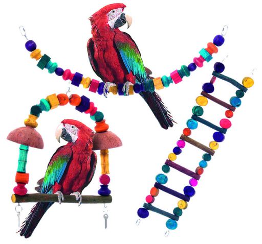 für 12.1€ kaufen ···· Miscota Poland, Czech Republic, Greece and Hungary - Online Shop for Pet Supplies Toys for Birds Hagen L.W WOODEN COLLECTION 40 PC KIT PAJARO PEQ Living World® Create Your Own Bird Toys is a do-it-yourself toy kit that lets you create your own bird toys. This is the perfect item for people who want to build custom-made toys specifically suited for their birds. The kit contains all you need to make at least 4 unique bird toys. You will find a variety of textures, shapes and colours that have been carefully selected to create interest, encourage play, exercise, and help condition your birds beak. All pieces are made of non-toxic materials and are safe for chewing and manipulation with your birds beak, tongue and feet. Once you have created your unique toys, place them where they can be easily accessed. All Living World® bird toys, including this one, are designed to keep birds stimulated by encouraging shredding, chewing and preening. For Small & Medium birds. Wooden Collection.\n40-piece kit includes:\n32 Assorted wooden pieces\n4 Clasps\n2 Leather ropes\n1 Cotton rope\n1 Sisal rope\n ····· 104201576