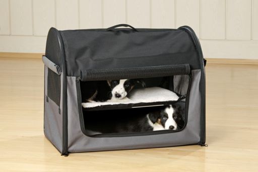 für 67.95€ kaufen ···· Miscota Poland, Czech Republic, Greece and Hungary - Online Shop for Pet Supplies Transport Carriers for Dogs Trixie CASETA DESMONTABLE M 50*50*70 AZUL/GRIS - Polyester\n- Ideal place for the pet at home, on journeys or at exhibitions\n- Door can be completely zipped closed\n- With net inserts for good air circulation\n- Netting can be covered up to protect the pet inside\n- Particularly stable due to metal framework\n- Can be opened at the front and top\n- 2 side pockets and carrying straps\n- With handy transport bag\n- Simply wipe clean\n- Size: M 50 × 50 × 70 cm \n- Colour: black/grey\n ····· 104204987