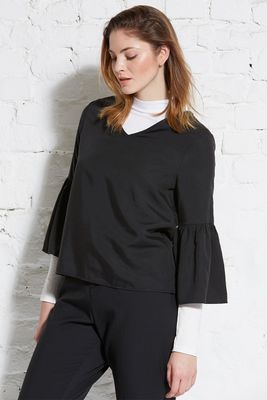 ····· 1038665Die Volant sleeve blouse ist eine Bluse aus fließendem TENCEL mit V-Ausschnitt und ausgestellten Volant-Ärmel in Länge. Die Bluse kombiniert den Volant-Trend der 70er Jahre mit aktueller Eleganz.