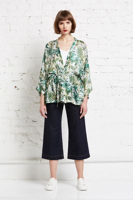 Dieser super edle Seidenkimono versetzt uns gedanklich in eine wunderschöne, grüne Dschungellandschaft. Schnell übergeworfen verleiht er jedem Basic Outfit einen ganz equisiten Look und speziellen Farbakzent.