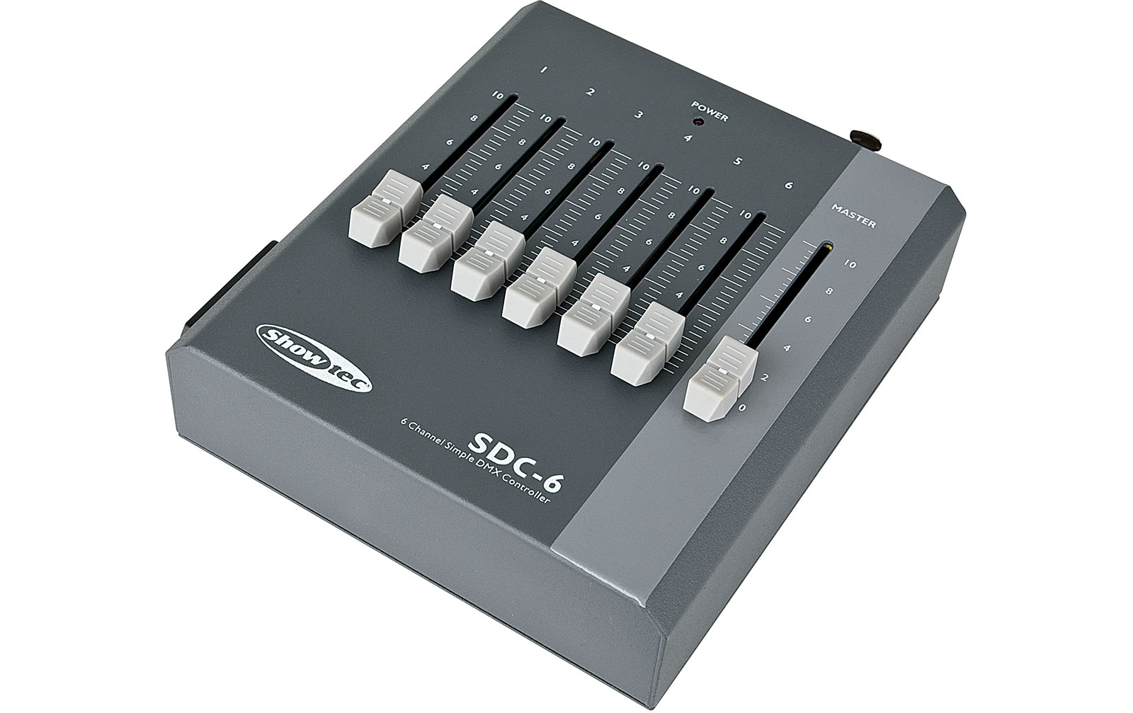 20: Showtec SDC-6 DMX Controller: Das SDC-6 ist ein kleine, batteriebetriebene 6 Kanal DMX Konsole. Ideal geeignet für Ausstellungen, kleine Shops und zum Testen Ihres DMX Equipments. Features:Kompaktes Lichtmischpult mit 6 KanälenMaster-Dim-SchiebereglerBa