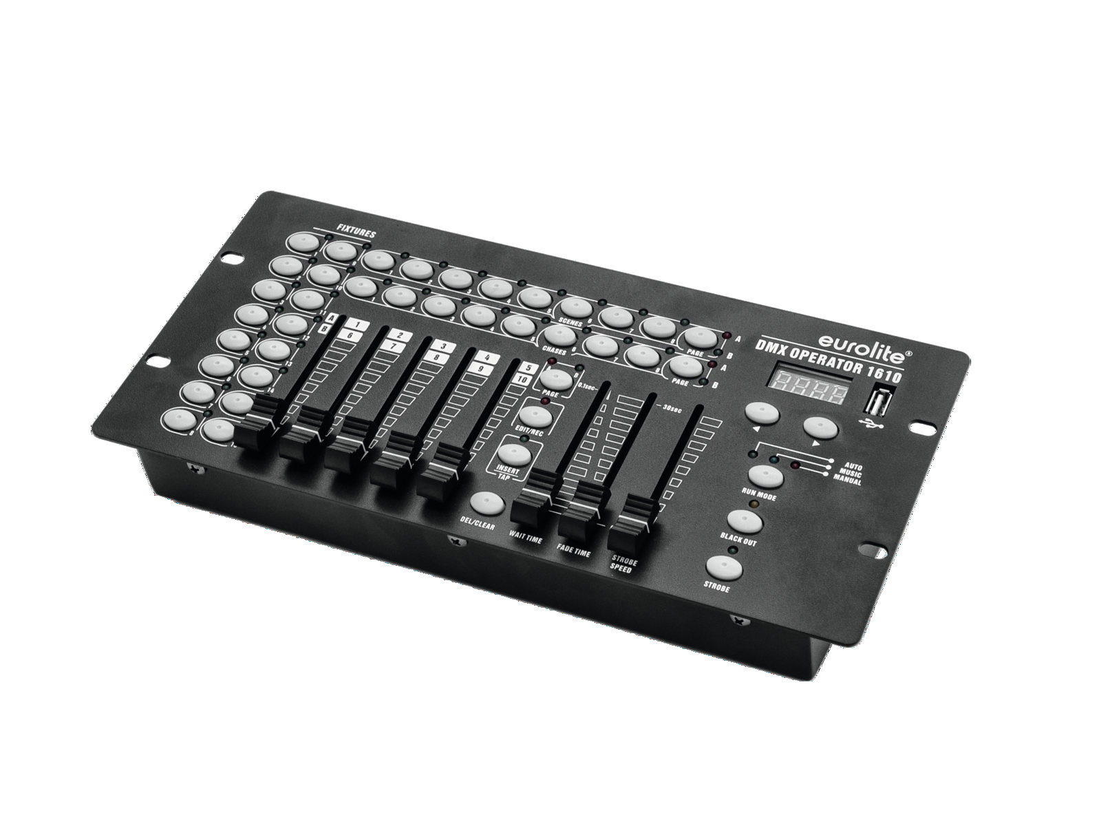 Eurolite DMX Operator 1610 Controller: Features: 160 Steuerkanäle für 16 Geräte mit je 10 DMX-Kanälen USB-Anschluss zur Datenspeicherung der Lichtshows 16 programmierbare Szenen 16 programmierbare Chases mit jeweils bis zu 200 Szenen Chase-Wiedergabe