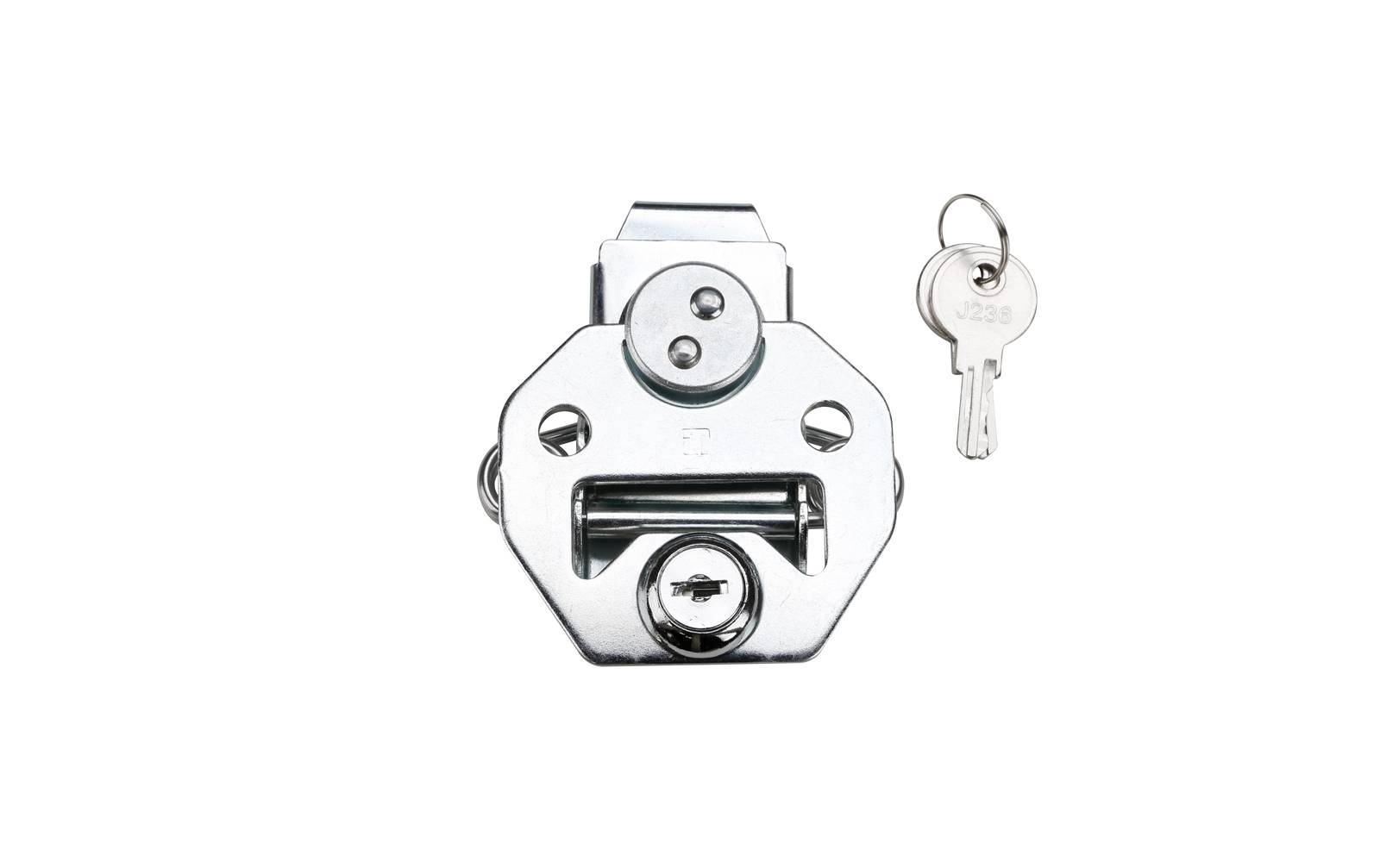 20: Adam Hall 17250 CL Butterfly-Verschluss groß, abschließbar, ohne Schale: Features:Produktart: Verschlüsse Typ: Butterfly Verschlüsse Material: Stahl Oberfläche: verzinkt Ø Befestigungslöcher: 5,1 mm Abschließbar: Ja Breite: 79 mm Höhe: 91 mm Gewi