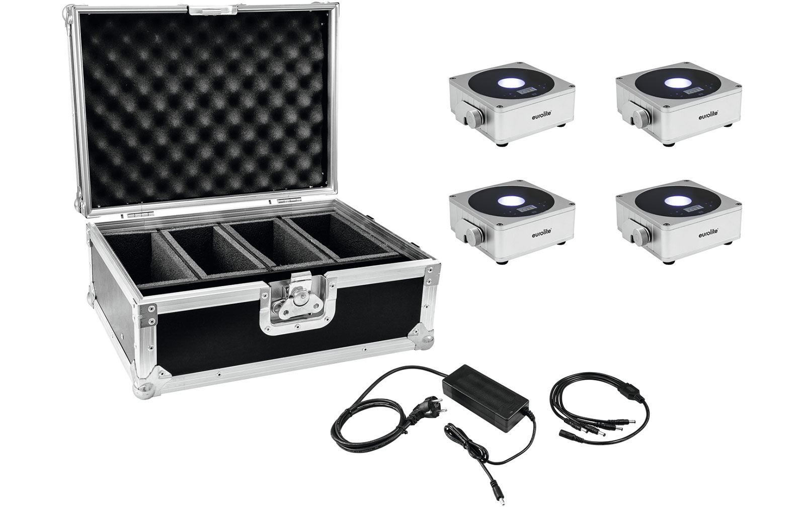 Eurolite Set 4x AKKU Flat Light 1 silber + Case + Ladegerät: Set bestehend aus:4x EUROLITE AKKU Flat Light 1 sil1x ROADINGER Flightcase 4x AKKU Flat Light Serie1x EUROLITE Ladenetzteil 4x Akku Flat Light SerieFeatures:Eurolite AKKU Flat Light 1 sil Fl