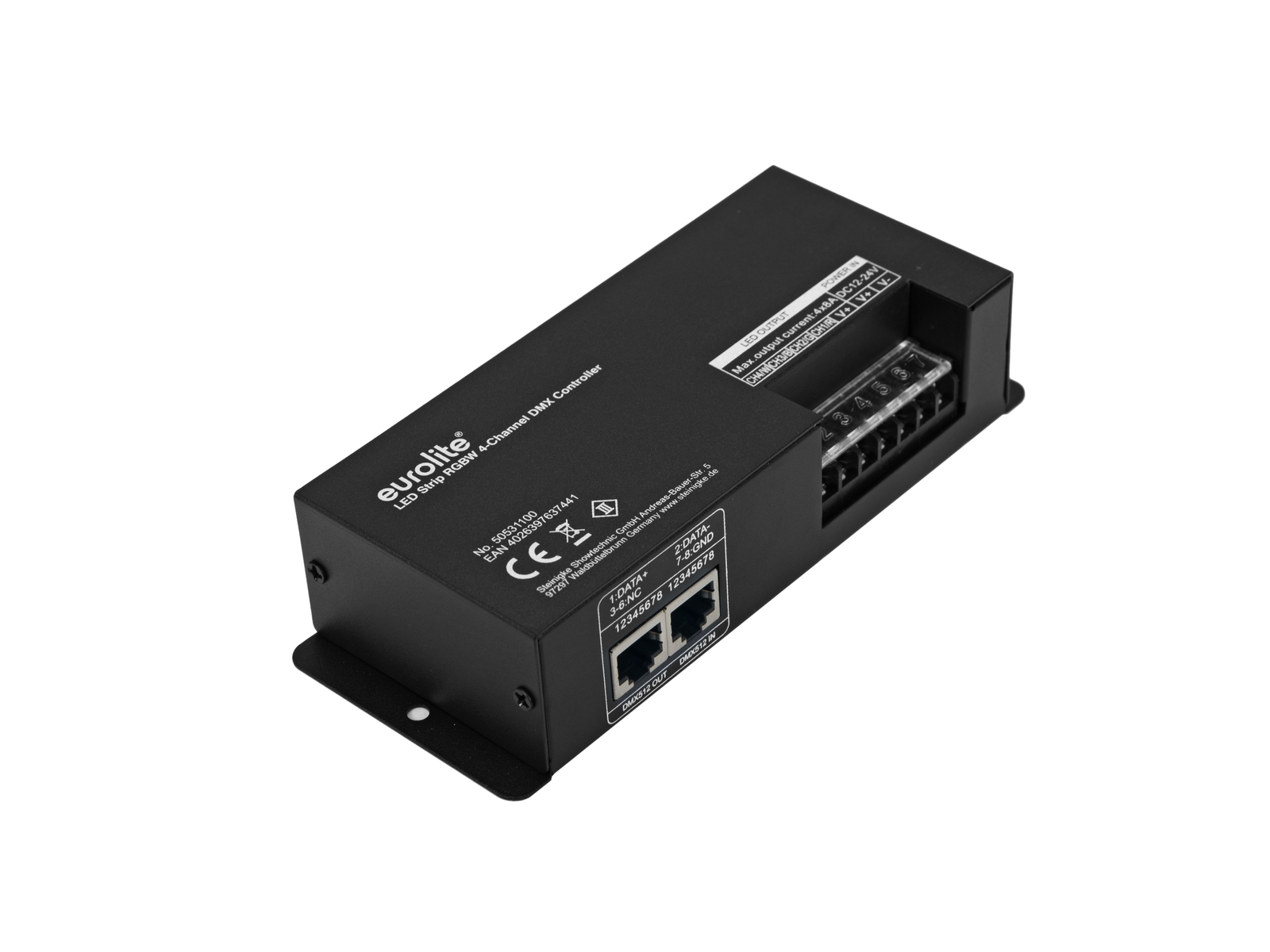 20: Eurolite LED Strip RGBW 4-Kanal-DMX-Controller: Features:Kompakter LED-Controller zur Ansteuerung von RGBW-LEDs (12-24 V) über DMX Wandelt Standard-DMX512-Signale in PWM-Signale z. B. für LED-Streifen 4 getrennte Steuerkanäle zur Farbmischung von roten