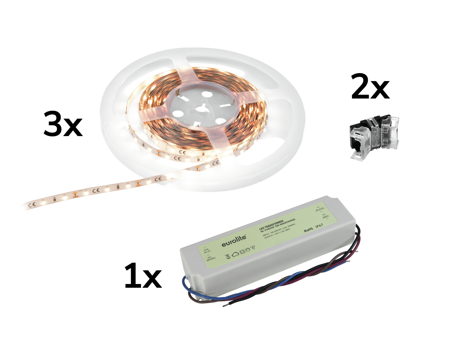 Eurolite Set LED Strip 3000K 15m Constant Current + Trafo 24V: Set bestehend aus:3x: EUROLITE LED Strip 300 5m 3528 3000K 24V Constant Current1x: EUROLITE Elektronischer LED Trafo, 24V, 5A, IP672x: EUROLITE LED Strip Verbinder 2Pin 8mmFeatures:Eurolite LE