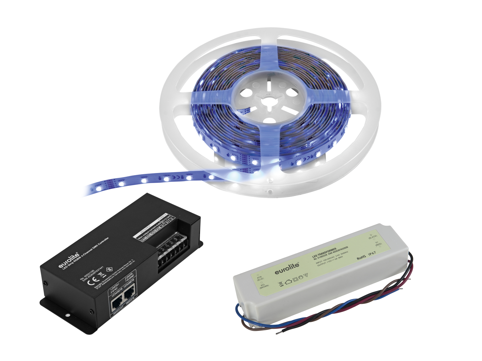 Eurolite Set LED Strip RGBWW 5m + DMX Controller + Trafo 24V: Set bestehend aus:1x: EUROLITE LED Strip 300 5m RGBWW 24V1x: EUROLITE LED Strip RGBW 4-Kanal-DMX-Controller1x: EUROLITE Elektronischer LED Trafo, 24V, 5A, IP67Features:Eurolite LED Strip 300 5m