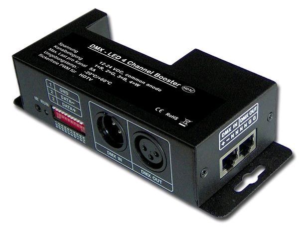 DMX Controller RGBW, 5A x 4 Kanäle: Ausgezeichneter, leistungsstarker Decoder, welcher das eingehende DMX-Signal in 4 Kanäle (RGBW, Minussignale) mit je 5A maximaler Stromstärke konvertiert (mit PWM). Die Start-DMX-Adresse kann am Gerät eingestellt we