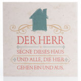 ··· Haussegen mit Segensspruch Material: Jura Marmor = Sedimentgestein (Kalkstein) Verarbeitung: Tafel mit farbigem Aufdruck Mit Aufhängevorrichtung und Wandabstandhalter an der Rückseite In schwa