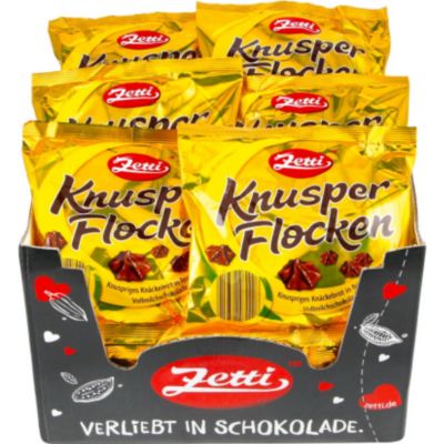 ··· Zetti Knusperflocken 350 g, 26er PackImmer griffbereit aus der praktischen Großpackung! \nZetti Knusperflocken 350 g, 26er Pack \nKnuspriges Knäckebrot in feiner Vollmilchschokolade - Vollmilchschokolade 68% mit Roggenknäckebrot 25%