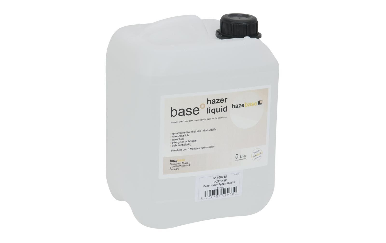 20: Hazebase Base*Hazer Spezialfluid 25l Kanister: Features:Auf Wasserbasis Geruchsneutral Toxikologisch unbedenklich Nicht gesundheitsschädlich Kanister wiederverwendbar Biologisch leicht abbaubar Nicht entzündlich Unterliegt ständiger Kontrolle Made in G