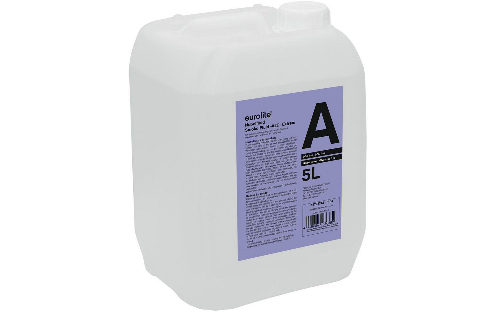 20: Eurolite Smoke Fluid -A2D- Action Nebelfluid 5l: Features:Gebrauchsfertige Nebelflüssigkeit für Nebelmaschinen Empfohlener Einsatzzweck: feiner Nebel für Laser- und Lichtshows und permanent stehende Nebelflächen Auf Wasserbasis Geruchsneutral Gefahrst