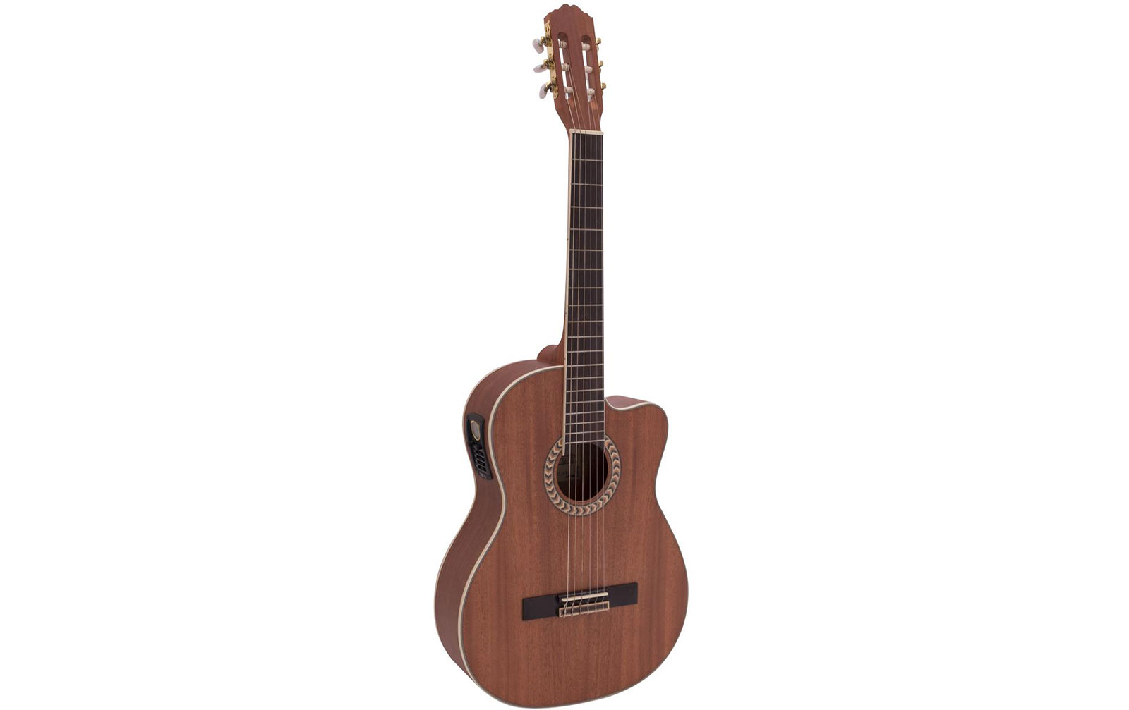 20: Dimavery CN-300 Klassik-Gitarre, mahagoni: Features:Farbe: natur Korpus: Mahagoni Hals: Nato Griffbrett: Palisander, 21 Bünde Brücke: Palisander Mensur: 650 mm Sattelbreite: 50 mm Inkl. Tonabnehmersystem mit 3-Band-EQ und Tuner Versandgewicht: 2,60 kg I