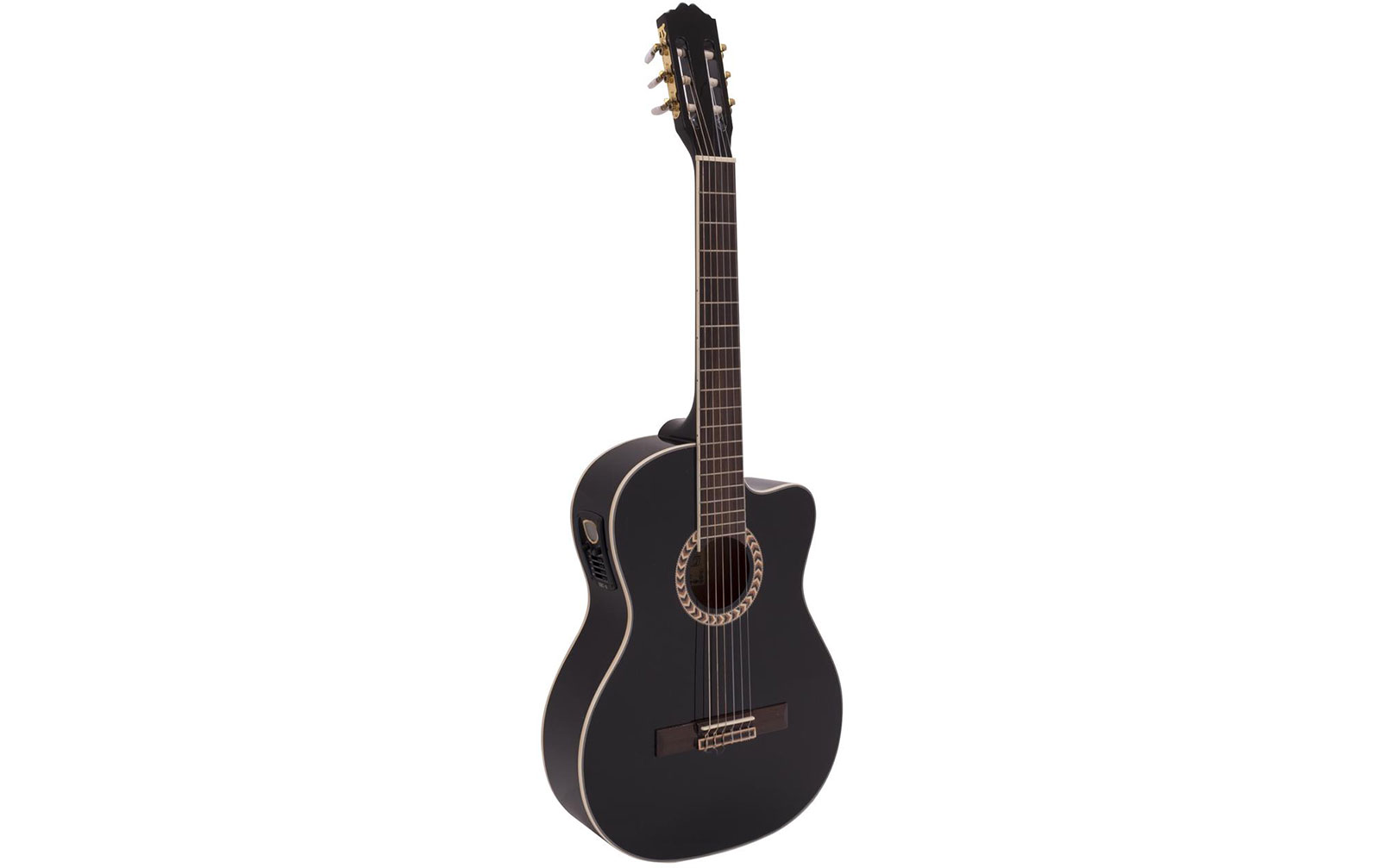 20: Dimavery CN-600E Klassik-Gitarre, schwarz: Features:Farbe: schwarz Decke: Fichte Korpus: Sapele mit Cutaway Hals: Nato Griffbrett: Palisander Brücke: Palisander Mensur: 650 mm Sattelbreite: 50 mm Inkl. Tonabnehmersystem mit 3-Band-EQ und Tuner Versandgew
