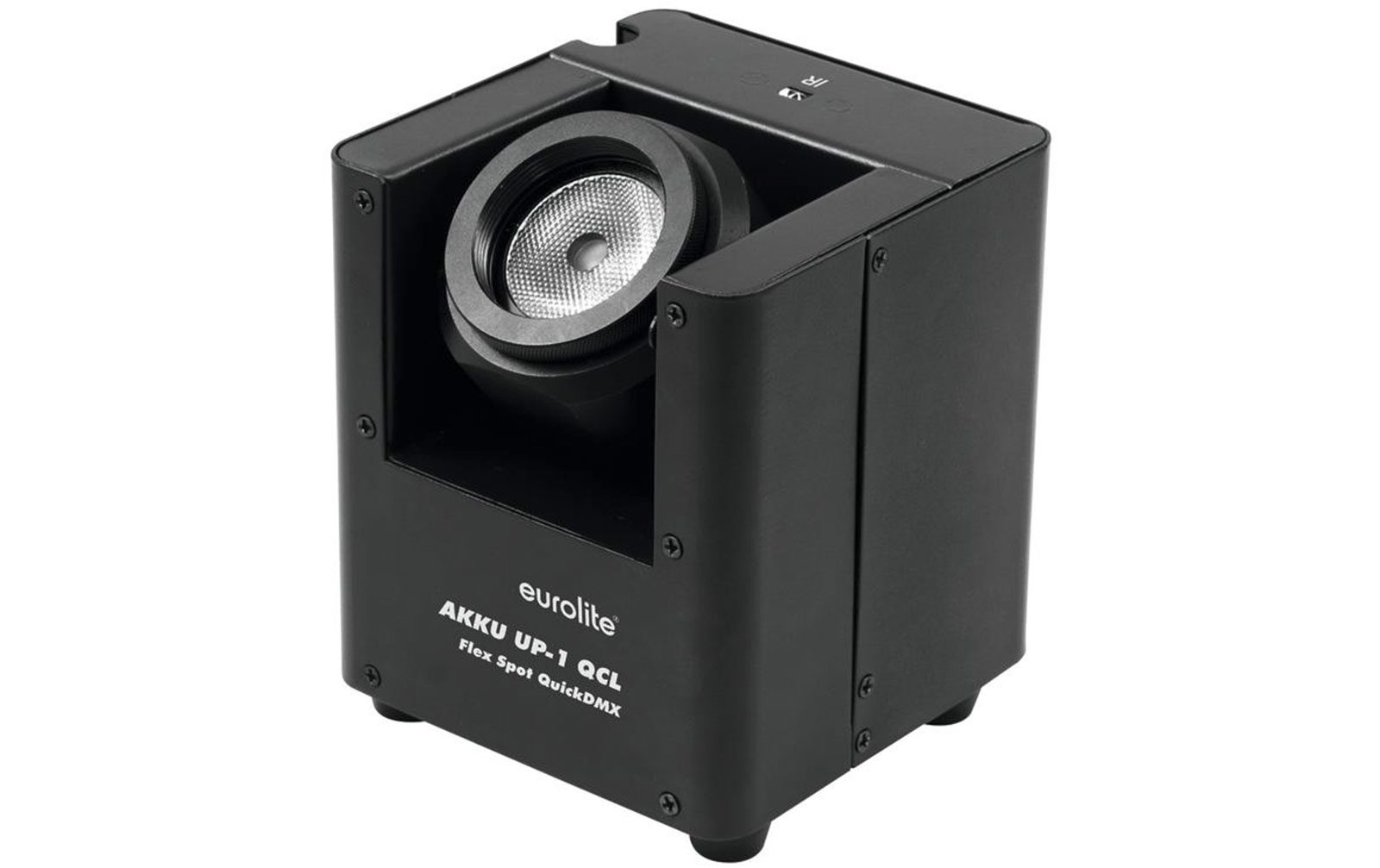 20: Eurolite AKKU UP-1 QCL Flex Spot QuickDMX: Features:Kompakt und lichtstark Ausgestattet mit einer 15-W-QCL (Quadcolor-LED) in Rot, Grün, Blau und Weiß Neigungswinkel des LED-Kopfes manuell einstellbar Änderung des Abstrahlwinkels (von 9° auf 15°) dur