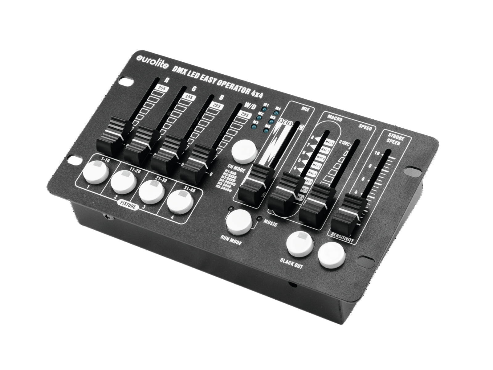 20: Eurolite DMX LED EASY Operator 4x4: Features: DMX-Controller zur Ansteuerung von gängigen LED-Scheinwerfern Einfache Bedienung 4 Scheinwerfer mit RGBW-LEDs getrennt oder kombiniert steuerbar DMX-Kanäle für Rot, Grün, Blau, Weiß und Master Verschieden