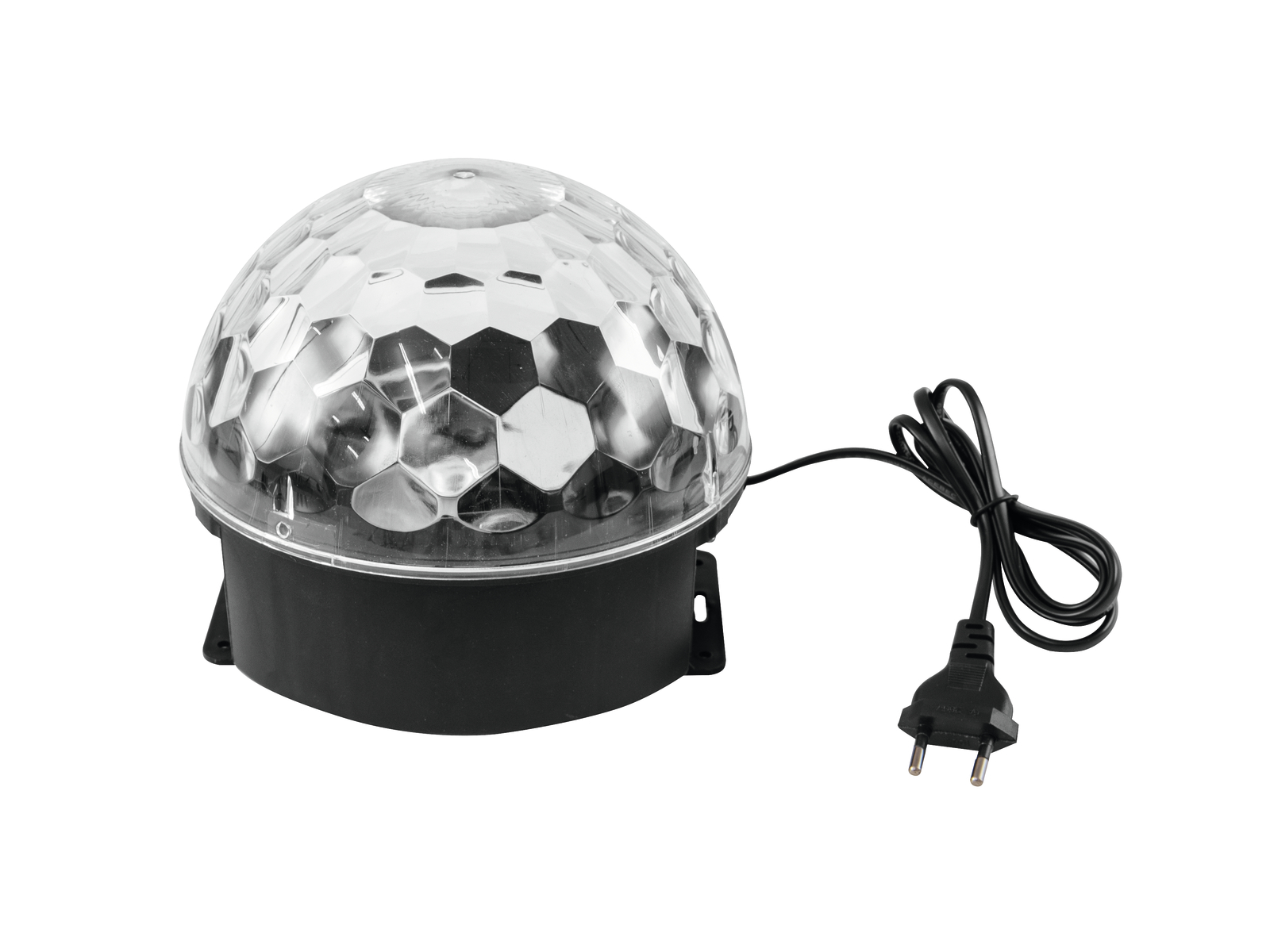 Eurolite LED BC-4 Strahleneffekt: Features: Klare, facettierte Oberfläche sorgt für einzigartige Strahleneffekte Ausgestattet mit sechs 1-W-LEDs in den Farben Rot, Orange, Blau, Weiß, Grün, Violett 20 Umdrehungen (180°) pro Minute sorgen für kreisfÃ