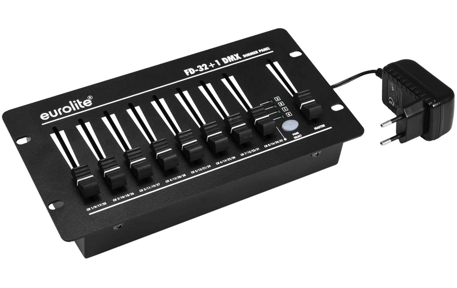 20: Eurolite FD-32+1 DMX Dimmer Panel: Features:Einfacher DMX-Controller zur bequemen Ansteuerung von Lichteffektgeräten mit DMX512-Schnittstelle (z. B. Scheinwerfer und Dimmer) Einfach anschließen und bedienen ohne aufwendige Programmierung 8 Kanalfader zu