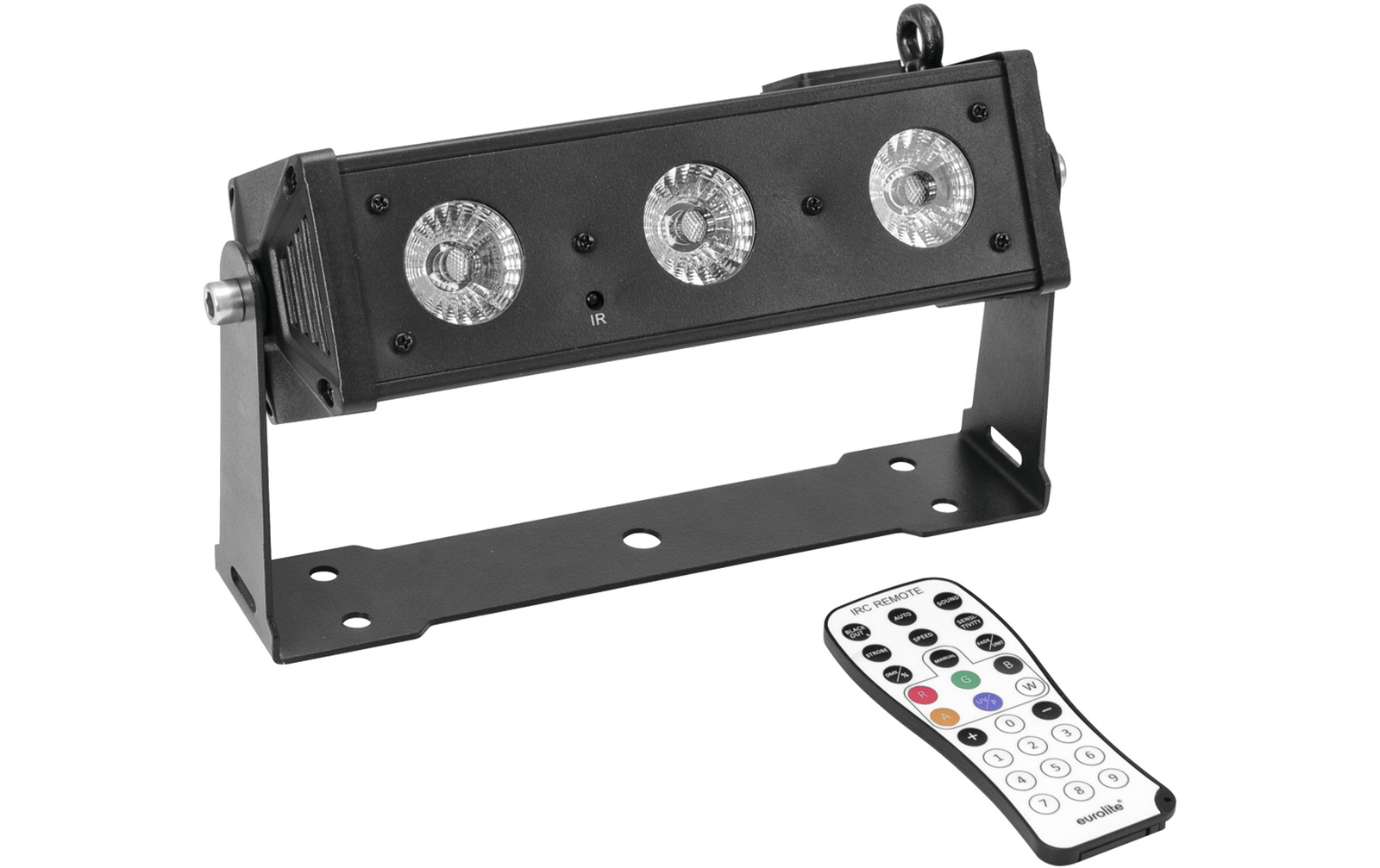 20: Eurolite LED BAR-3 HCL Leiste: Features:3 leistungsstarke 12-W-RGBAW+UV-LEDs (6in1)Auto-, Musik-, Master/Slave- und DMX-ModusIntegrierte Showprogramme im Auto- und MusikmodusDirekte Farbwahl für 19 FarbenStufenlose RGBAW+UV-Farbmischung, Farbwechsel, Far