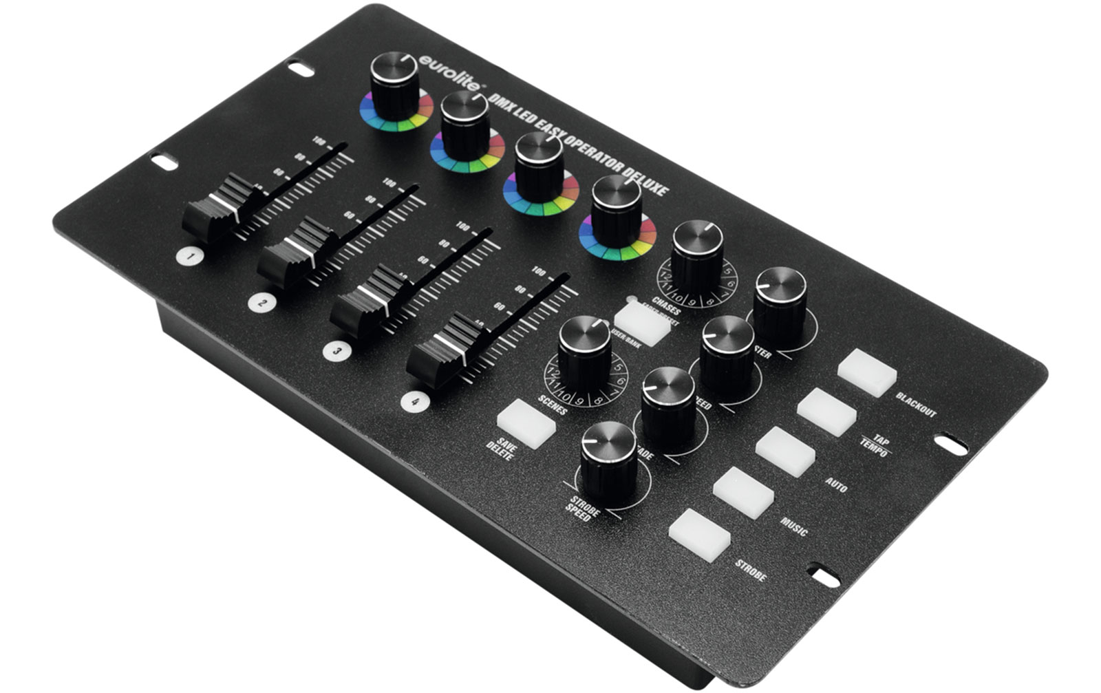 20: Eurolite DMX LED EASY Operator Deluxe: Features:DMX-Controller zur Ansteuerung von gängigen LED-Scheinwerfern Einfache Bedienung 4 LED-Scheinwerfer oder 1 KLS-Anlage mit 4 Segmenten steuerbar DMX-Kanäle für Rot, Grün, Blau, Amber, Weiß, UV, Strobe un