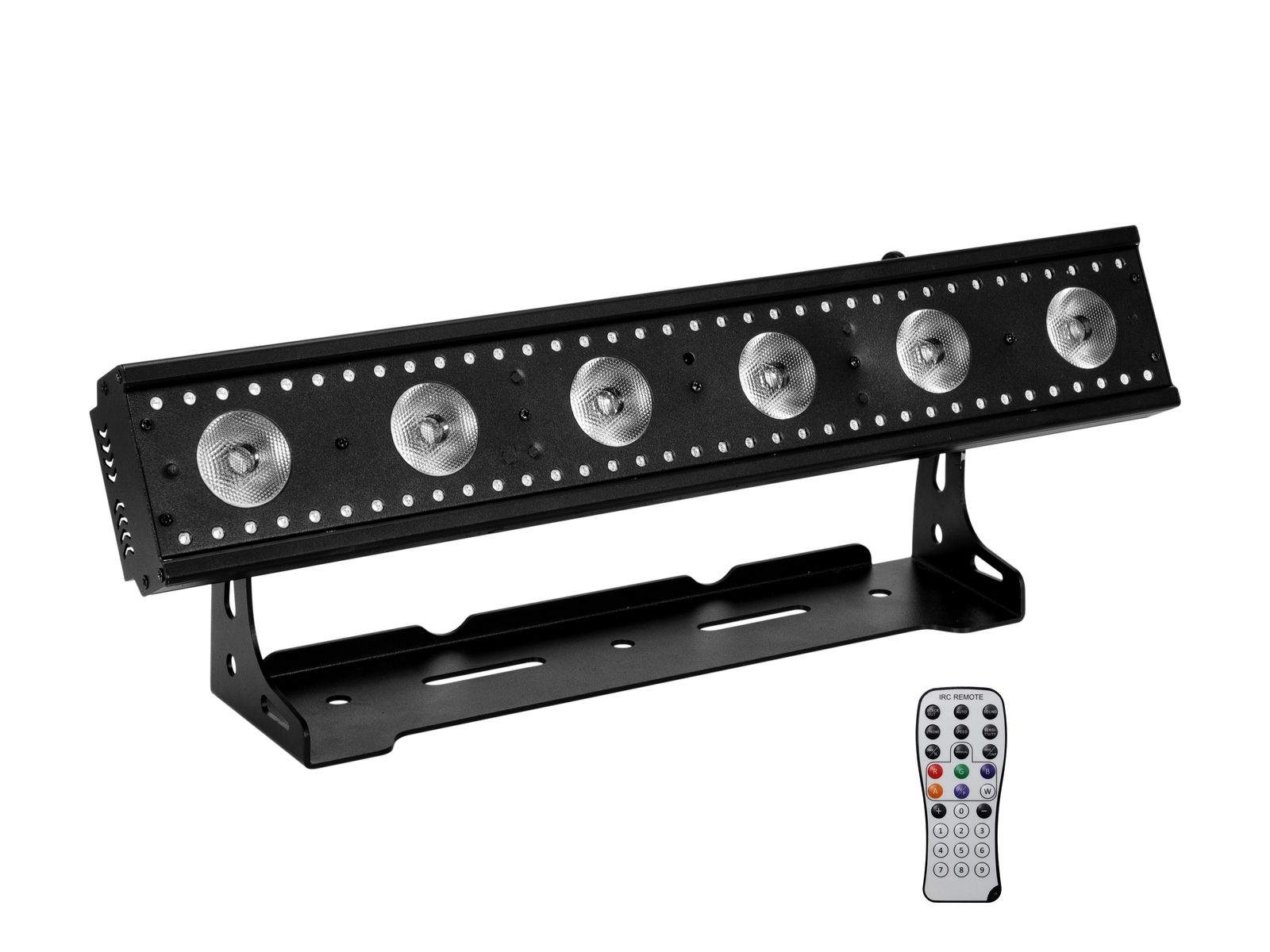 Eurolite LED PIX-7 Hybrid SCL Leiste: Features:6 leistungsstarke 9-W-RGBA/CW/WW+UV-LEDs (7in1) für breites Stimmungslicht und Schwarzlicht 72 zusätzliche 0,5-W-RGB-LEDs für dynamische Lauflicht- und Strobe-Effekte Auto-, Musik-, Master/Slave- und DMX-M