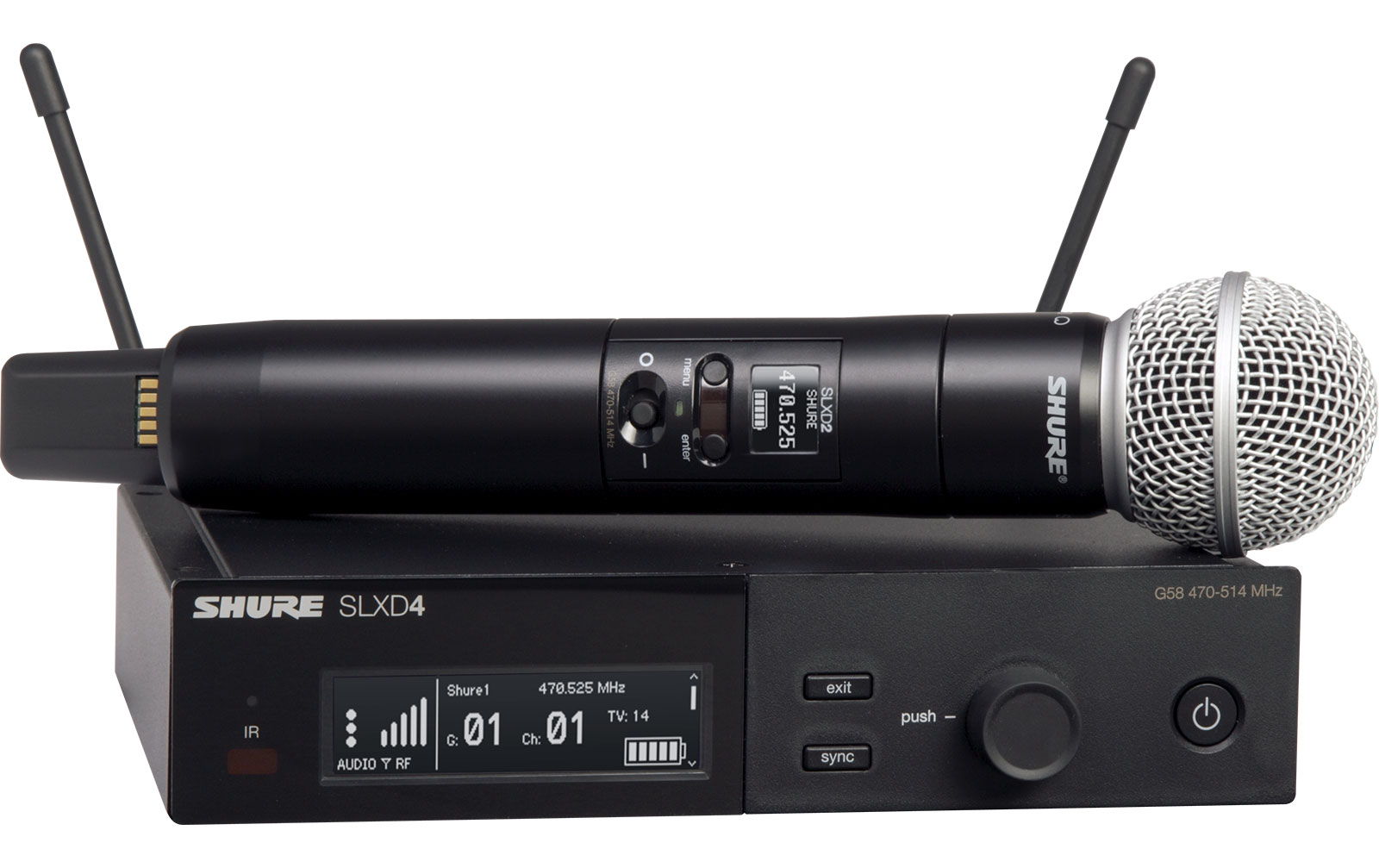··· SLX-D drahtloses digitales Mikrofonsystem bestehend aus einem SLXD4 Empfänger mit 19`-Montagezubehör und einem SLXD2 Handsender mit SM58 Mikrofonkapsel (dynamisch, Niere), Frequenzbereich K59 (606-650 MHz)