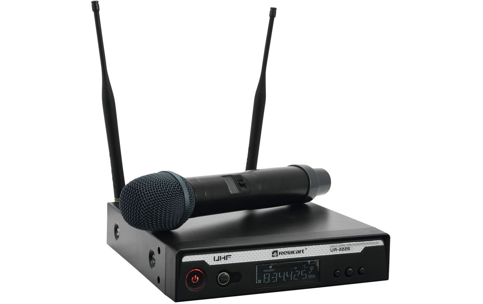 20: Relacart UR-222S 1-Kanal UHF System: Features:Multifrequenz-Funkempfänger mit True-Diversity-Technik für höchste Empfangsqualität Dynamisches Handmikrofon im ergonomischen, aluminiumlegierten Gehäuse 2 anmeldefreie Frequenzbereiche: 823-832 MHz (Dupl