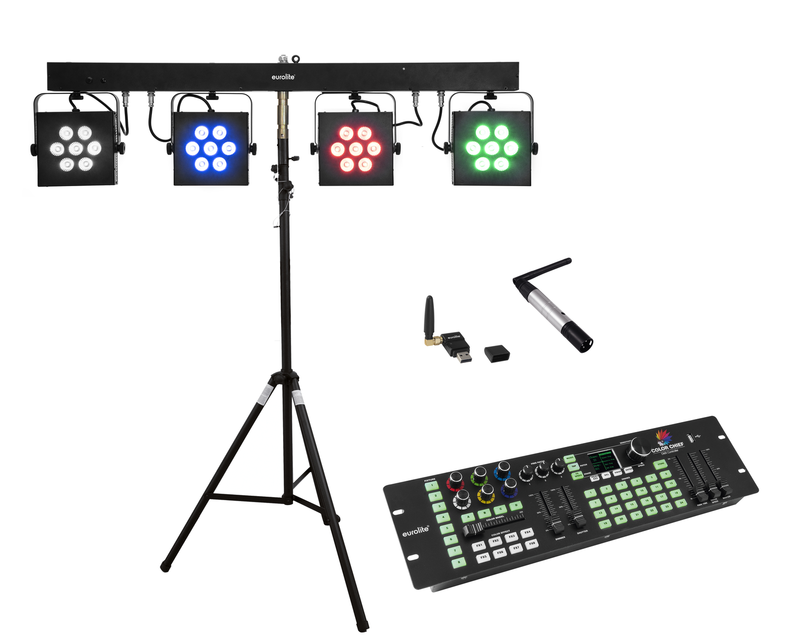 Eurolite Set LED KLS-3002 + Controller + STV-40S-WOT Stahlstativ: Set bestehend aus:1x 42109895: EUROLITE LED KLS-3002 Next Kompakt-Lichtset1x 70064575: EUROLITE DMX LED Color Chief Controller1x 70064700: EUROLITE QuickDMX Funksender1x 70064704: EUROLITE