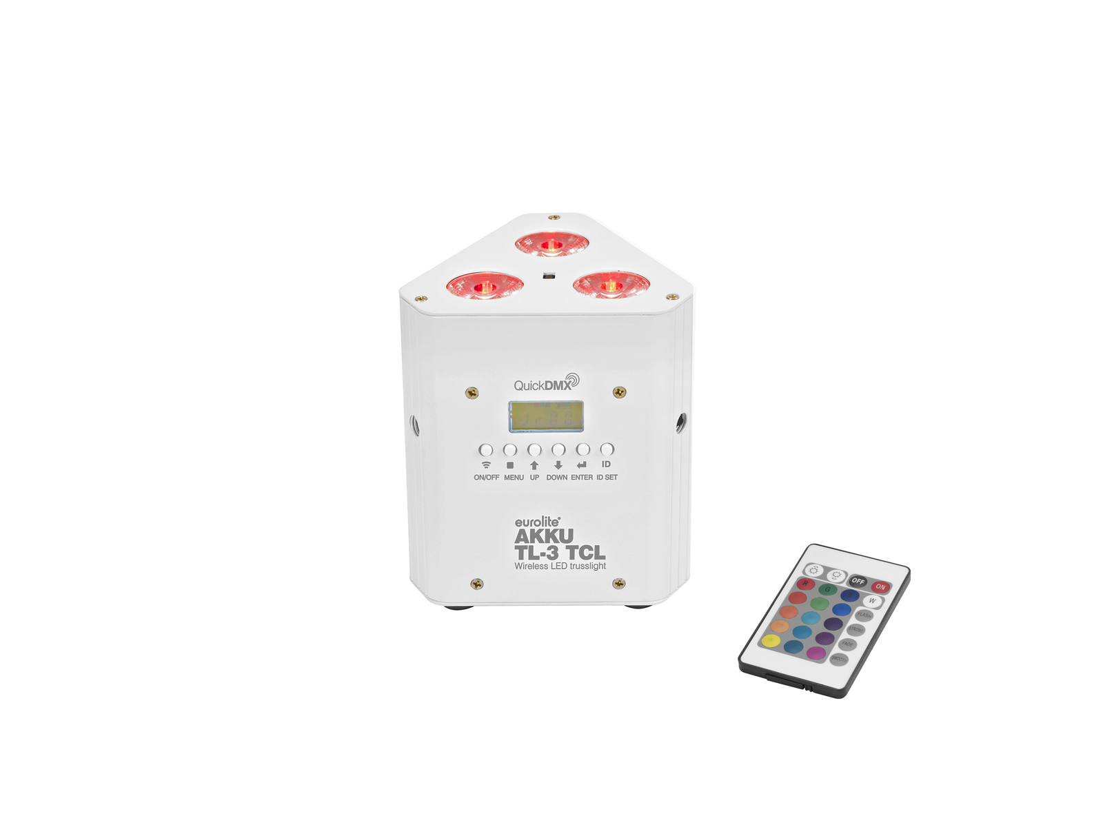 20: Eurolite AKKU TL-3 TCL Trusslight QuickDMX ws: Features:Kompakt und lichtstark, dadurch ideal geeignet zur Montage im Trussing Kabellos, flexibel und vielseitig einsetzbar Mit integriertem QuickDMX-Funkempfänger für die drahtlose Übertragung von DMX512
