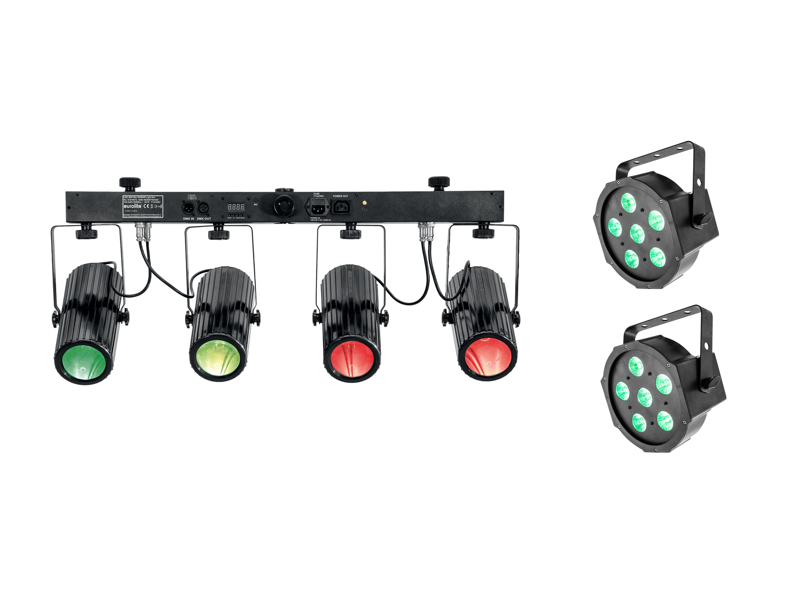 20: Eurolite Set 2x LED SLS-6 TCL Spot + LED QDF-Bar RGBAW Lichtset: Set bestehend aus:2x 51915361: EUROLITE LED SLS-6 TCL Spot1x 51918574: EUROLITE LED QDF-Bar RGBAW LichtsetFeatures:51915361 Eurolite LED SLS-6 TCL Spot Flacher Scheinwerfer mit 6 x 8-W-3in1-