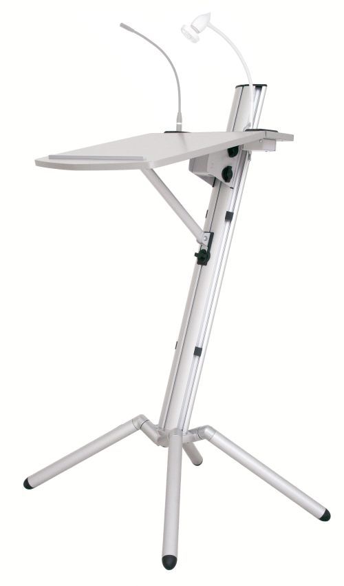 ··· Stabile, schräg gestellte Aluprofilsäule mit erhöhten Füßen (für große Beinfreiheit). Elegante Manuskriptablage mit geprägter Aluminiumoberfläche und Anschlagleiste, Höhe und Neigung stufenlos einstellbar. Durchführungsbuchse in der Ablage und