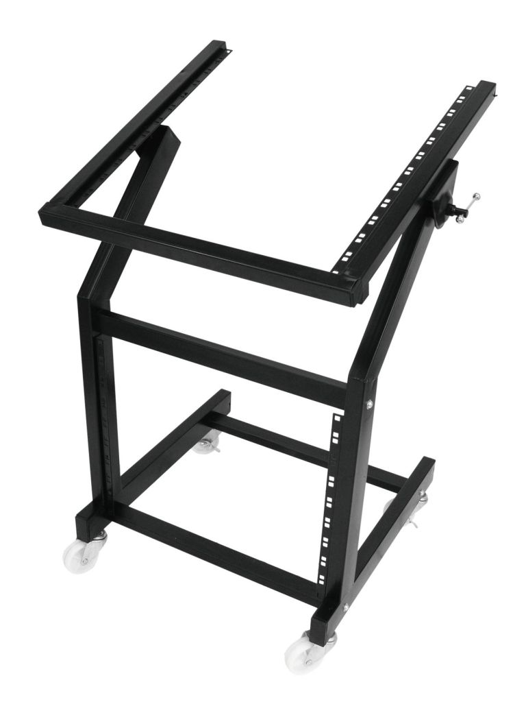 20: Omnitronic Rackwagen 12HE/10HE schwenkbar auf Rollen: Features:Sehr stabiles Stahl-Rahmengestell Oberer Bereich schwenkbar mit 12 HE Montagemöglichkeit für 19` Geräte Rahmenunterteil mit 10 HE für waagerecht zu montierende Geräte 4 Rollen, davon 2 mi