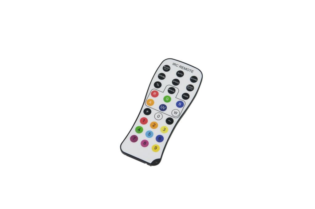 20: Eurolite IR-7 Fernbedienung: Features:IR-Fernbedienung für Lichteffektgeräte, u. a. LED TL-3 TCL 3x3W, ACCU TL-3 TCL, ACCU Bar-160, ACCU SLS-180 Reichweite bis zu 10 m Technische Daten:Maße (LxBxH): 110 x 46 x 7 mm Batterie: 1 x CR 2025 Gewicht: 20 g V