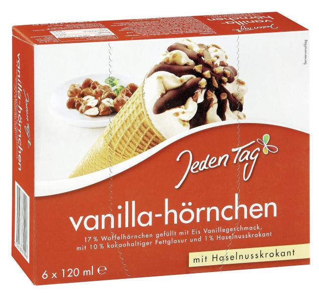 20: Waffelhörnchen gefüllt mit Vanilleeis, kakaohaltiger Fettglasur und Haselnusskrokant.