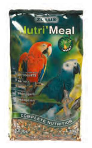 ··· Complete Food Mixes for Small animals Zolux Nutri'meal Loros Nutri'Meal Parrots is a complete diet for large parrots, with fruits and shelled peanuts. Complete your birds diet with regular fresh fruits and vegetables, (apples, mandarins, bananas, carrots, chicory and celery hearts), egg food and dried fruits and a constant supply of cuttlefish bone.Striped sunflower, White sunflower, Cardi seed, Red sorghum, White sorghum, Buckwheat, Corn, Hempseed, Shelled peanuts, Deshelled peanuts, Papaya, Mango, Wheat, Paddy rice, Black oats, Flax, Vetch, Katjang, Peas, Hulled oats, White millet, Essential oils (aniseed, bergamot, pine) Additives (flavouring, ).Size: 210 × 100 × 400 mmWeight: 3 kg