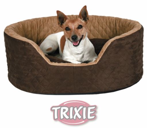 Miscota Poland, Czech Republic, Greece and Hungary - Online Shop for Pet Supplies Beds for Dogs Trixie Crib Luma - Suede-look\n- Polyester cover\n- With gem applications\n- Polyester fleece filling\n- Removable reversible cushion\n- Non-slip nylon bottom\n- Size: 50 cm\n- Colour: brown/beige ····· 104209210