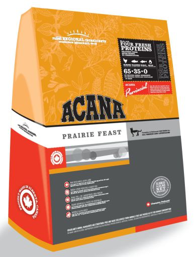 für 19.95€ kaufen ···· Miscota Poland, Czech Republic, Greece and Hungary - Online Shop for Pet Supplies Dry Food for Cats Acana Wild Prairie Feast (no grain) For Adult Dogs of All Breeds and Sizes\nAlbertas vast prairies are renowned for the diversity of world-class foods produced in its rich fertile soils and cold northern lakes.\nReflecting our prairie heritage, ACANA Wild Prairie features cage-free Cobb chicken and whole eggs from local prairie farms, and wild-caught fish from our cold northern lakes all delivered fresh each day!\nGrain-free to reduce unwanted carbohydrates, ACANA features regional vegetables, fruits and botanicals for a rich supply of natural trace elements and antioxidants.\nMade from our regions best and freshest ingredients, ACANA keeps your cherished dog healthy and strong\nRich In Meat\nThe ultimate food mimics the one Mother Nature intended your dog to eat!\nMade with a full 60% of nourishing chicken, eggs, and fish, ACANA Wild Prairie matches your dogs evolutionary adaptation to a meat & protein rich diet, and its variety of fresh, local meats mirrors the diversity of your dogs natural diet.\n Cobb Chicken cage-free and delivered fresh each day from local prairie farms\n Grade A Eggs delivered fresh and whole each day from local prairie farms\n Wild-Caught Fish our Northern Walleye and Lake Whitefish are sustainably caught and delivered fresh each day\n Passed fit for human consumption, our local ingredients are truly fresh so theyre never frozen and arrive preservative-free each day.\nFresh, Local Fruits & Vegetables\nIn place of inappropriate cereal grains, ACANA Wild Prairie is loaded with a full 40% of fruits & vegetables including Red Delicious apples from the sun-drenched Okanagan valley, and butternut squash, Burbank potatoes and spinach greens from local prairie farms all bursting with goodness to support peak health and immunity.\nGrain-Free & Low Carbohydrate\nRich in protein and low in carbohydrates to match your dogs natural diet, ACANA Wild Prairie is free of high glycemic grains (such as rice and corn) found in conventional dog foods.\nLong associated with obesity and diabetes, high glycemic grains break down quickly, causing a rapid and large rise in your dogs blood sugar.\nGrain-free and low in carbohydrates, ACANA Wild Prairie causes your dogs blood sugar to rise less over a longer period of time so her sensitivity to insulin is beneficially increased and fat storage is decreased to achieve peak conditioning.\nLuxuriant Skin & Coat\nWe infused each morsel of ACANA Wild Prairie with marine-source Omega 3 (DHA, EPA) from wild-caught New Brunswick herring to support immunity and luxuriant skin & hair coat your dogs outer symbol of health and vitality.\nEnhanced Metabolism\nOrganic sea vegetables and botanicals including juniper berries, lavender flowers, sun-cured alfalfa and peppermint leaf enhance metabolism while nourishing and toning your dogs digestive tract.\nDesigned For Carnivores\nThey might look different, but your dog shares his anatomy with the grey wolf which means hes evolved as a carnivore and adapted for a diet rich in meat, protein, and fat.\nBased on this biological fact, and to produce a nutritional analysis that mirrors the diet Mother Nature would provide for your dog, ACANA is loaded with nourishing meat proteins and fats, while limiting unwanted carbohydrates and high-glycemic grains.\n Guaranteed Analysis\n Vitamins & Minerals\n Amino Acids\n Botanical Inclusions\nCaloric Content\nACANA mirrors the meat and protein concentrated diets that all dogs are evolved to eat, while reducing the carbohydrates and high-glycemic grains that cause blood sugar levels to rise and fluctuate.\nCompared to conventional foods, ACANA delivers more calories from protein and fat and fewer calories from carbohydrates, reducing the risk of obesity and diabetes and promoting your dogs peak health.\nMetabolic Energy for ACANA Wild Prairie Dog Food is 3615 kcal/kg (434 kcal per 250ml cup) with 30% of energy from protein, 40% from fat and 30% from fruits and vegetables.\nYour Dog Is Special\nJust like you, your dog is a unique individual and his feeding requirements will vary with his breed, environment, age and activity.\nThats why we suggest using this chart as a starting point, and monitoring your dogs weight and adjusting his rations as needed. We also recommend feeding him twice daily and always keeping fresh, clean water available.\nWhen switching diets, its important to transition your dog as it takes time for his digestive system to adapt to the richer nutrient levels in ACANA. Over a 5-7 day period, gradually mix in ACANA, increasing the amount each day so that by day 7 you are feeding 100% ACANA.\nHell love the change we guarantee it!\nFeeding Guidelines\nWeight of Dog Active Less Active\nKG LBS GR/DAY CUPS/DAY GR/DAY CUPS/DAY\n5 kg 11 lb 90 g c 60 g 12 c\n10 kg 22 lb 160 g 113 c 120 g 1 c\n20 kg 44 lb 270 g 2 c 180 g 1 12 c\n30 kg 66 lb 360 g 3 c 240 g 2 c\n40 kg 88 lb 450 g 3 c 300 g 2 12 c\n50 kg 110 lb 540 g 4c 360 g 3c\n60 kg 132 lb 630 g 5 c 420 g 312 c\nUse a standard 8 oz. measuring cup. Serve dry or lightly moistened. See your veterinarian regularly. To help maintain freshness, we recommend sealing the bag tightly and storing it in a cool, dry location.\nACANA Wild Prairie is formulated to meet the nutritional levels established by the AAFCO Dog Food Nutrient Profiles for all life stages.\n ····· 104201249